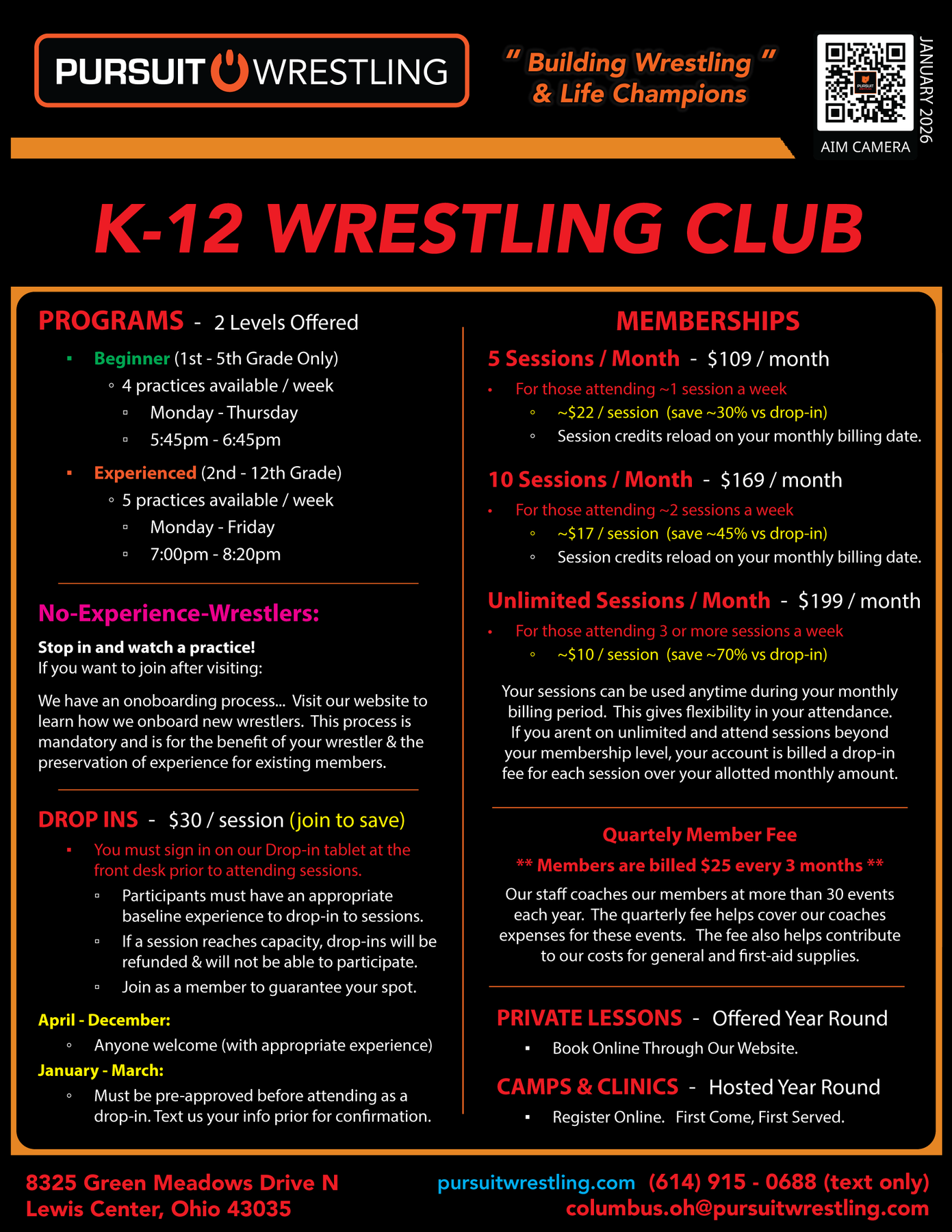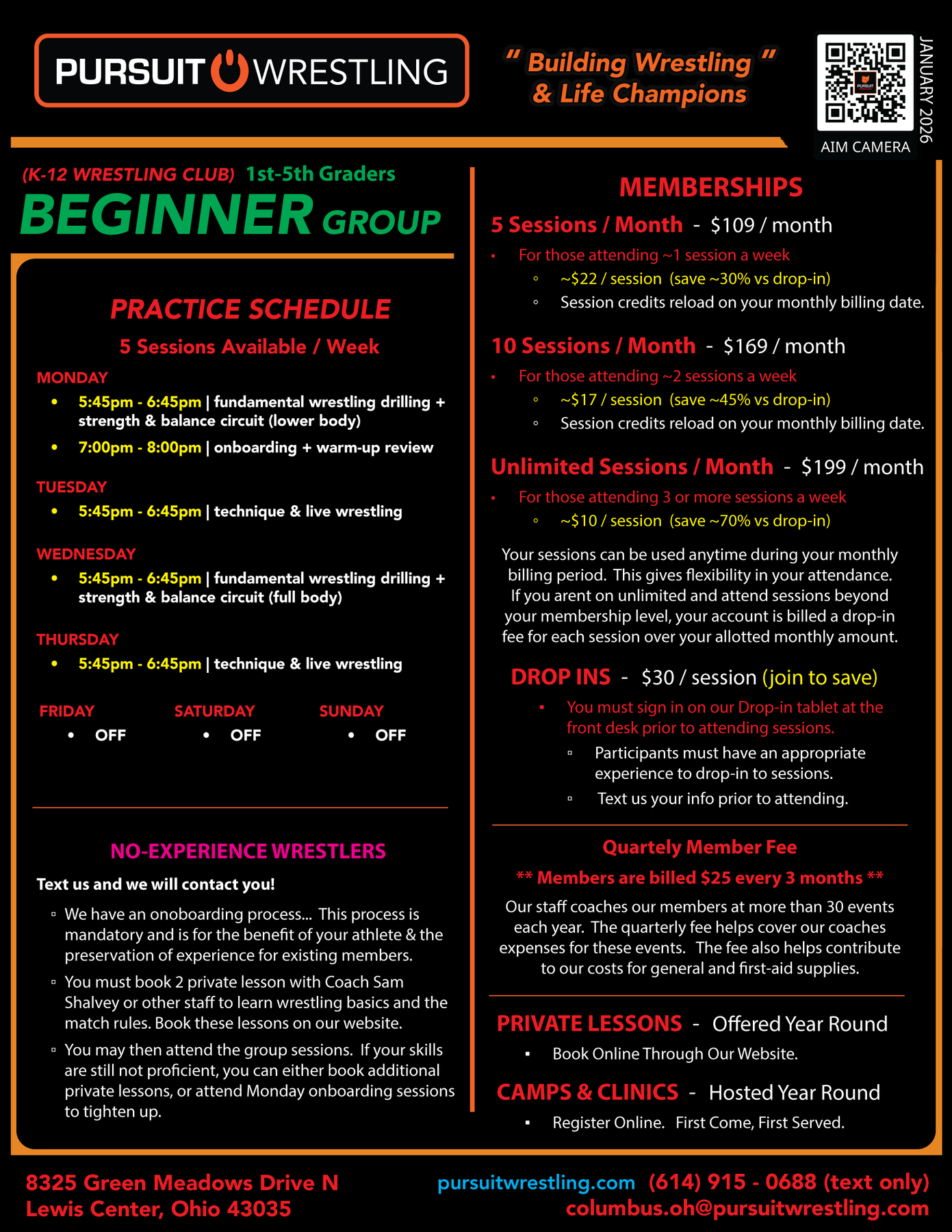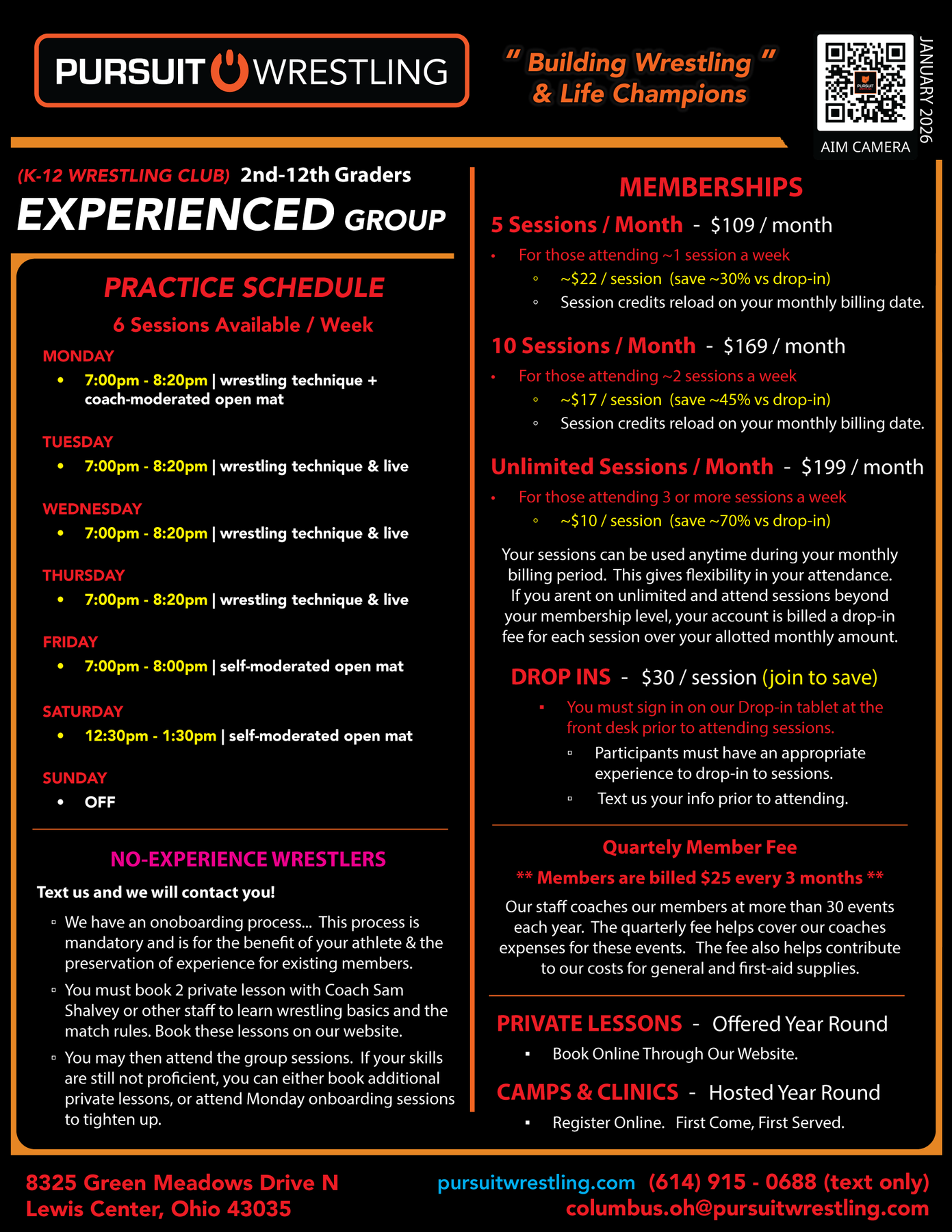 - No Experience Wrestlers must complete 2 private lessons prior to attending group practices.